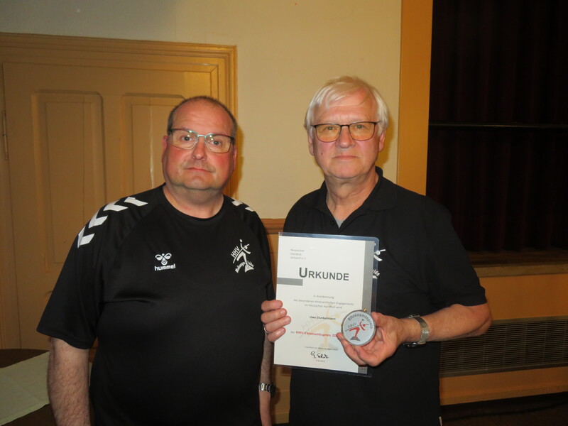 Anlässlich der Versammlung der Vereine am 24. Mai in Lauterbach, erhielt Uwe Dunkelmann aus den Händen seines Amtsnachfolgers Torsten Schmidt den Ehrenamtspreis des Hessischen Handball-Verbandes und die dazugehörige Medaille.